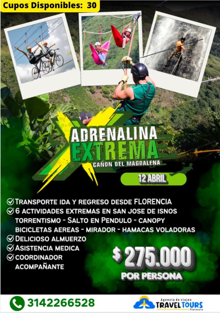 - 6 ACTIVIDADES EXTREMAS EN SAN JOSE DE ISNOS ( TORRENTISMO – SALTO EN PENDULO- CANOPY – BICICLETAS AEREAS – MIRADOR – HAMACAS VOLADORAS.)