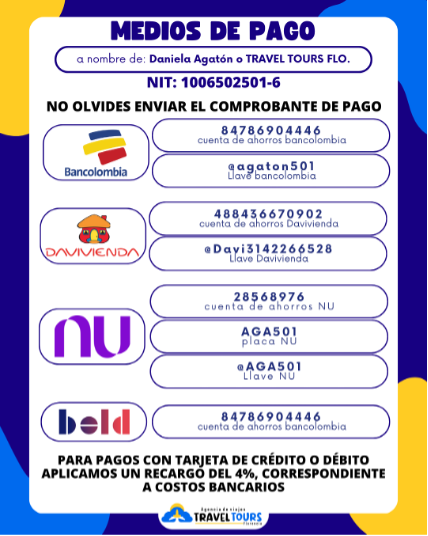 Travel Tours Florencia se hace responsable única y exclusivamente de los pagos o abonos que realizas a las cuentas autorizadas, tener comprobante de cualquier transferencia que realicen a las cuentas de la agencia, si envías dinero a una cuenta diferente a las autorizadas Travel Tours Florencia no se hace responsable.